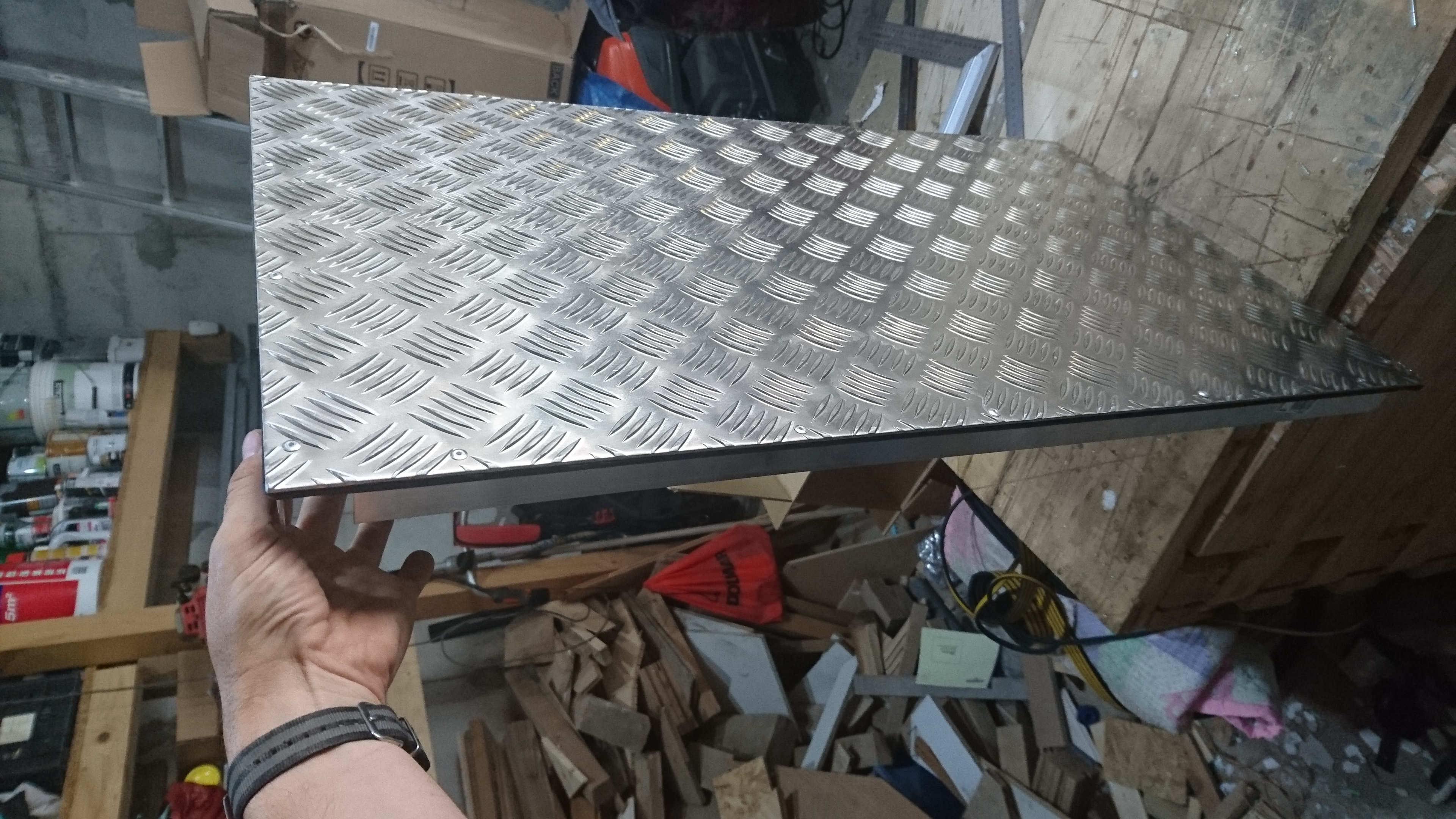 Voici donc la carcasse externe du nouveau coffre constitué d'une tôle d’aluminium larmé de 3-4,5 mm en 920*2660 repliée sur elle même (une punition à faire...